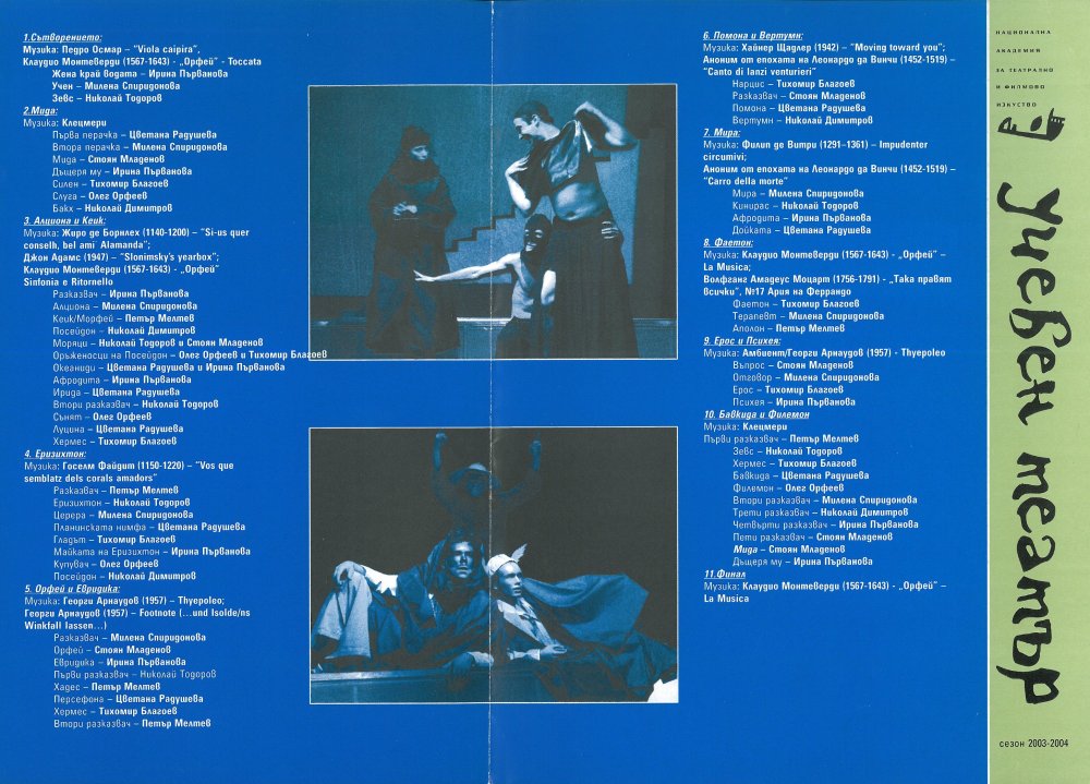 Текстът е по митове на Овидий. Хореогр.: Хореография. Хореогр.: Въздушна пластика. Хореогр.: Сценично движение. Дипломен спектакъл на студентите от IV курс с худ. рък. проф. Снежина Танковска. Премиера:31 октомври